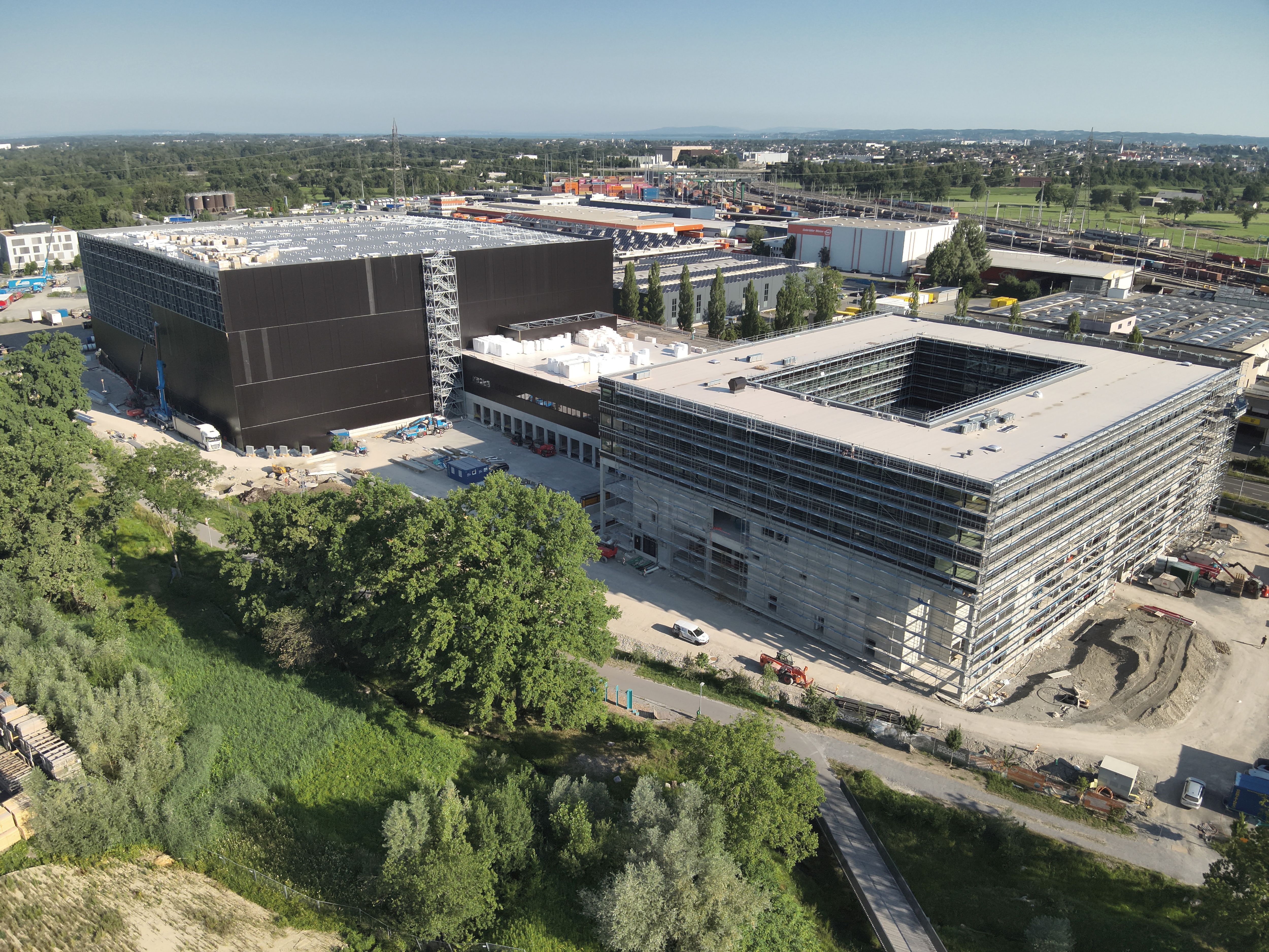 Auf einem 30.000 Quadratmeter großen Grundstück in Wolfurt realisiert Goldbeck Rhomberg derzeit für Gebrüder Weiss, ein international tätiges Transport- und Logistikunternehmen, ein hochmodernes Logistik- und IT-Center mit einem Hochregallager und einem Bürogebäude für rund 350 Mitarbeitende. Die Bauarbeiten verlaufen planmäßig: Das Herzstück des neuen Standorts bildet ein 34 Meter hohes Hochregallager mit Platz für 68.000 Paletten. Ergänzt wird die Anlage durch ein manuelles Lager und ein dreistöckiges Bürogebäude, das insbesondere die IT-Abteilung beherbergen wird. Nachhaltigkeit spielt für Gebrüder Weiss eine zentrale Rolle: Geplant sind eine Photovoltaikanlage, Dachbegrünung sowie Ladestationen für Elektro-Lkw und Elektro-Pkw. Großflächige Parkplätze werden bewusst vermieden. Stattdessen schafft Gebrüder Weiss Anreize für die Nutzung des öffentlichen Nahverkehrs. Die Fertigstellung des neuen Standorts ist für Ende 2025 vorgesehen.